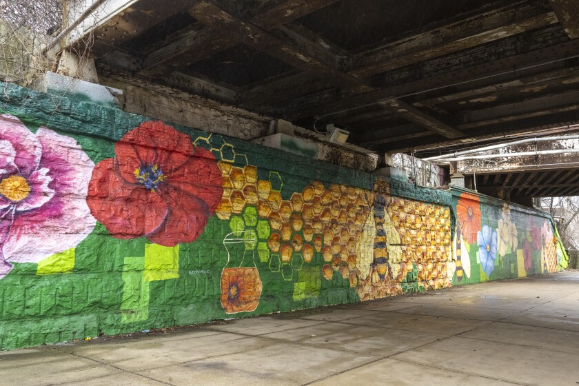 Neighborhood master gardeners helped artist Cyd Smillie as she crafted a mural with honeycombs, bees and blooms on the viaduct at 4600 W. Irving Park Road in Portage Park.