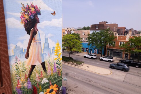A decade ago, Fisher created the Big Fruit mural visible from the Howard Street station, and a new mural — a facade on a facade — can be seen on the Blue Line.